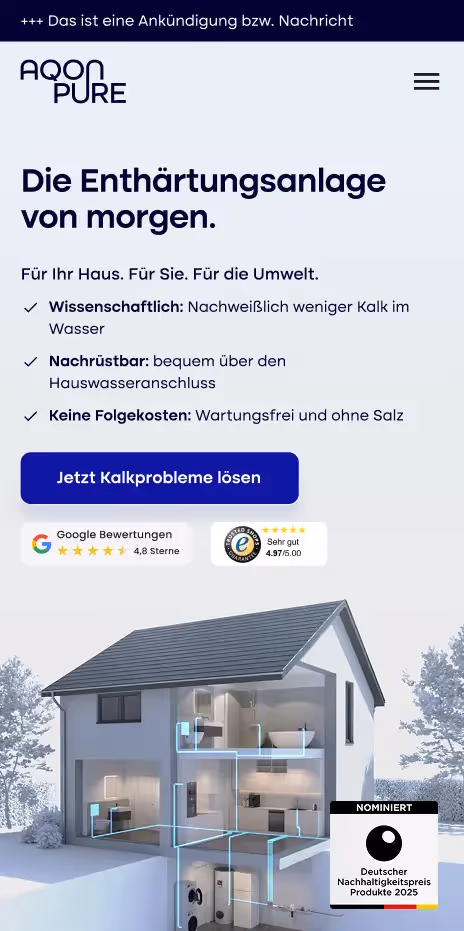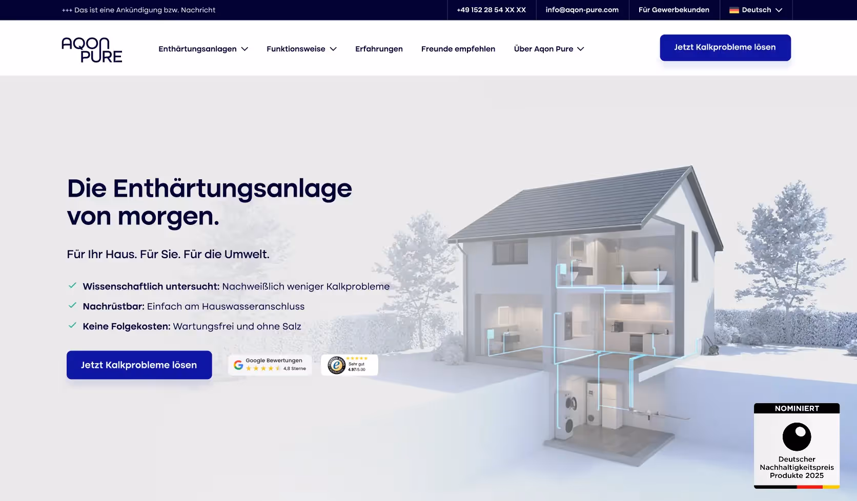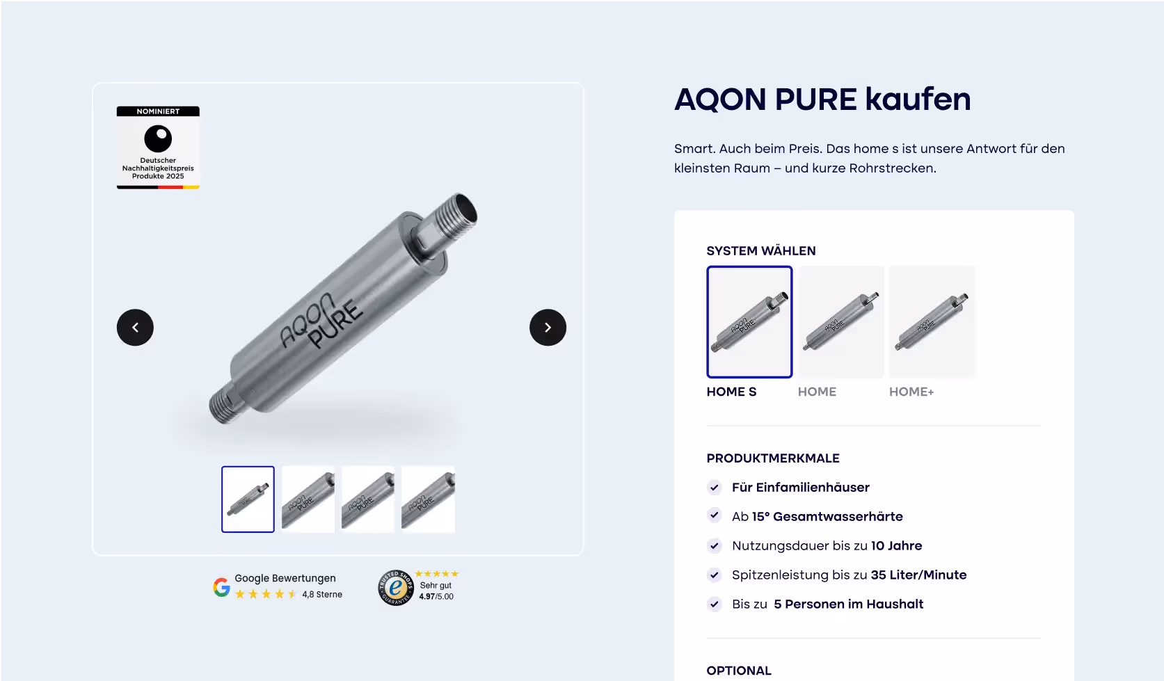 Webseite ansehenFür AQON Pure, Anbieter hochwertiger Enthärtungsanlagen, haben wir einen ganzheitlichen Website-Relaunch auf Shopify umgesetzt.Im Fokus standen drei Dinge: mehr Vertrauen, eine höhere Conversion-Rate und eine einfach zu pflegende Website für das Team.