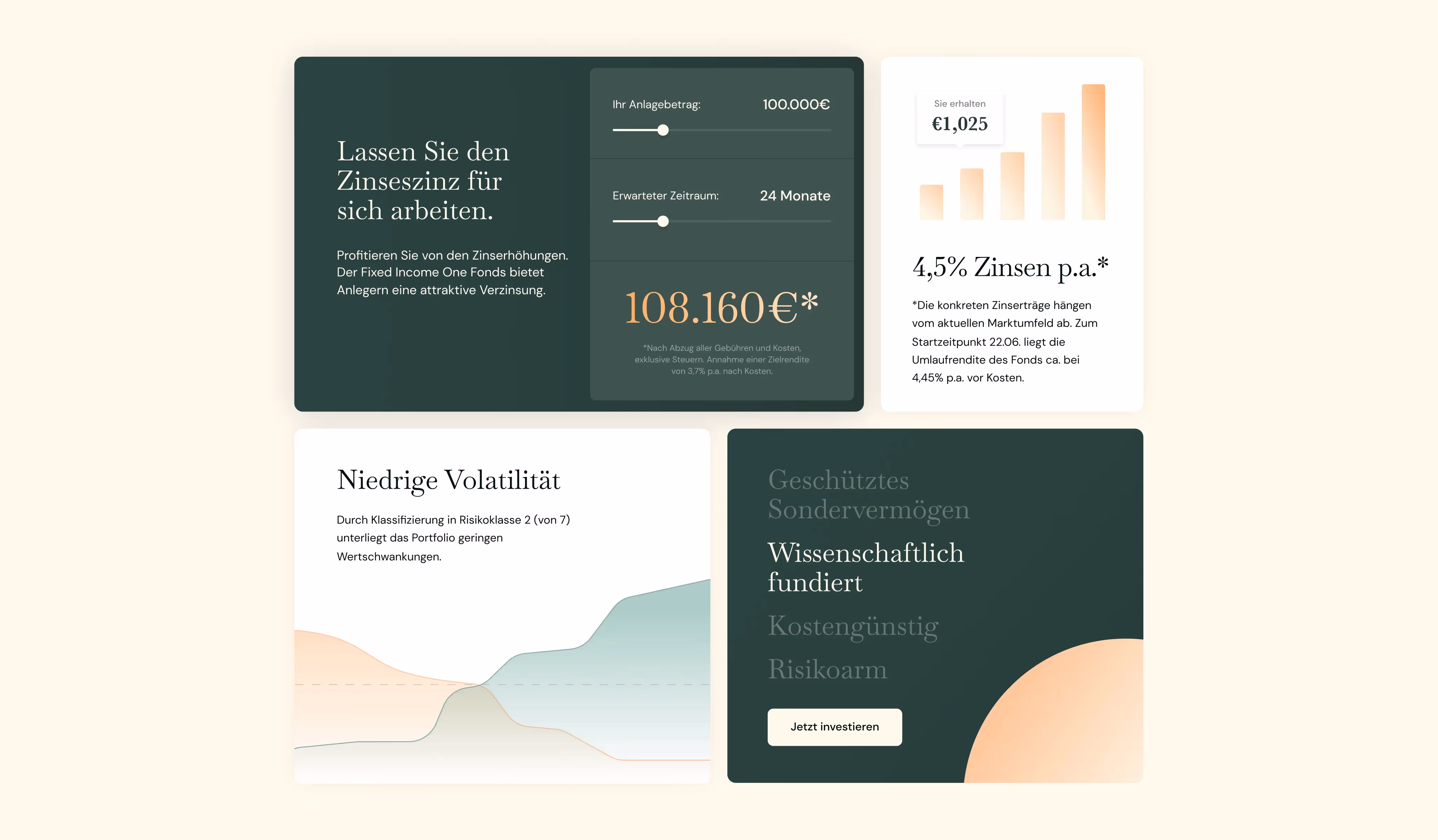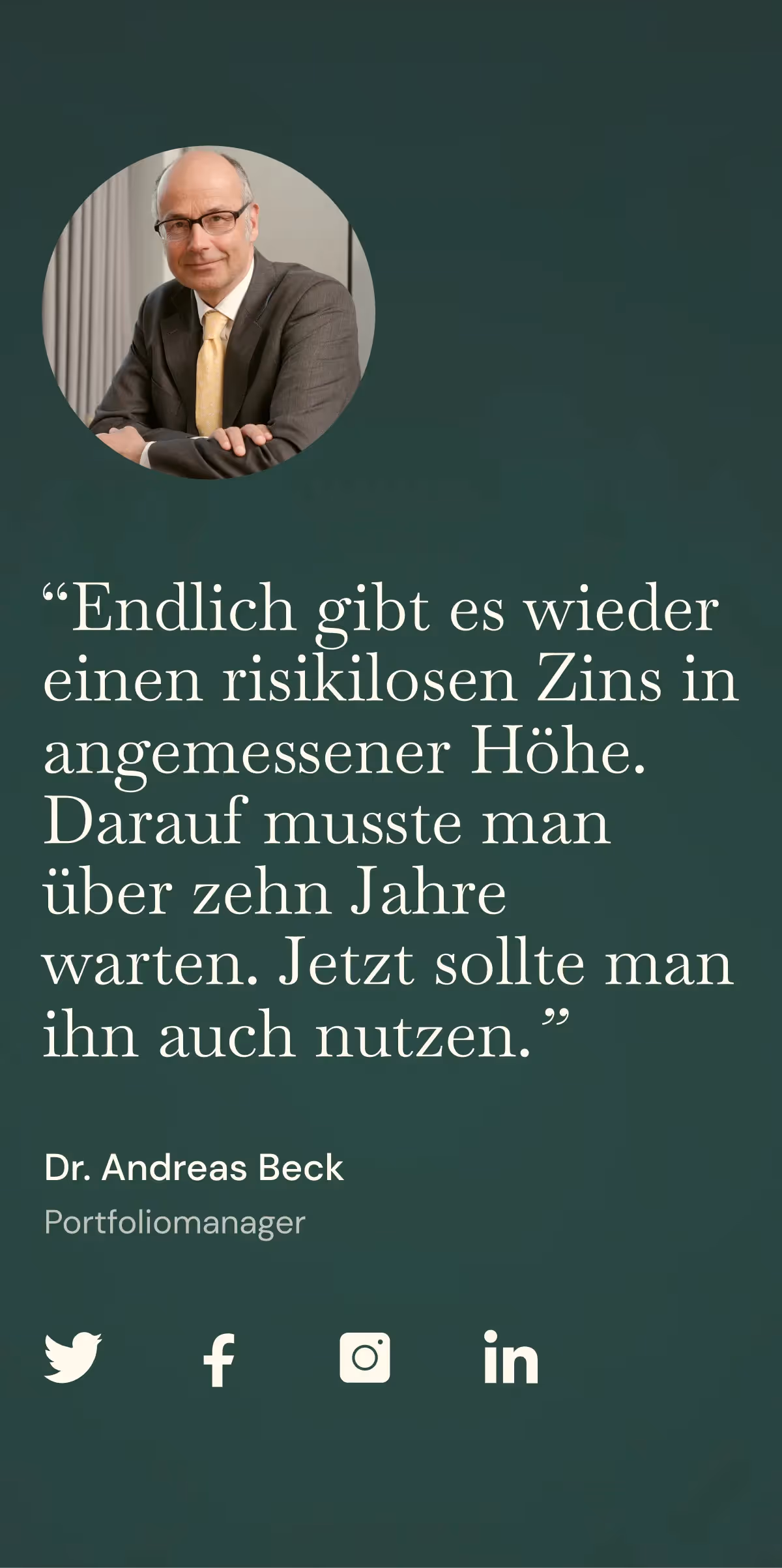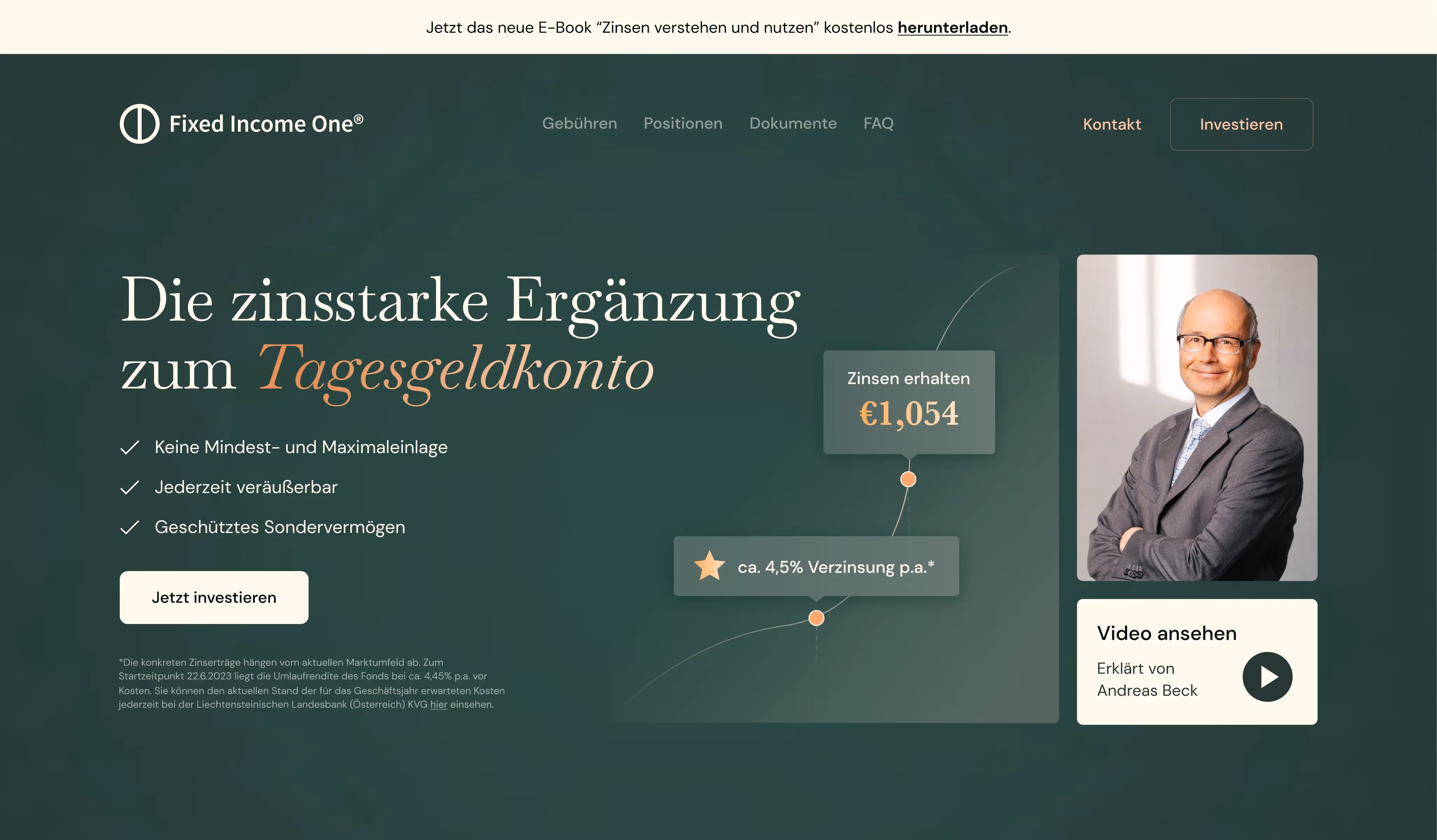 Webseite ansehenFixed Income One ist das neue Zinsportfolio der LLB Invest KAG mit Dr. Andreas Beck, Nicolas Kocher & Team. Banken und Versicherer geben oft nur einen Bruchteil der Zinserhöhungen an Ihre Kunden weiter. Mit einer Verzinsung von derzeit ca. 4,5% p.a. bietet das wissenschaftlich fundierte Portfolio von Dr. Andreas Beck & Team eine überlegene Alternative, um in vollem Umfang von der aktuellen Zinswende zu profitieren.
