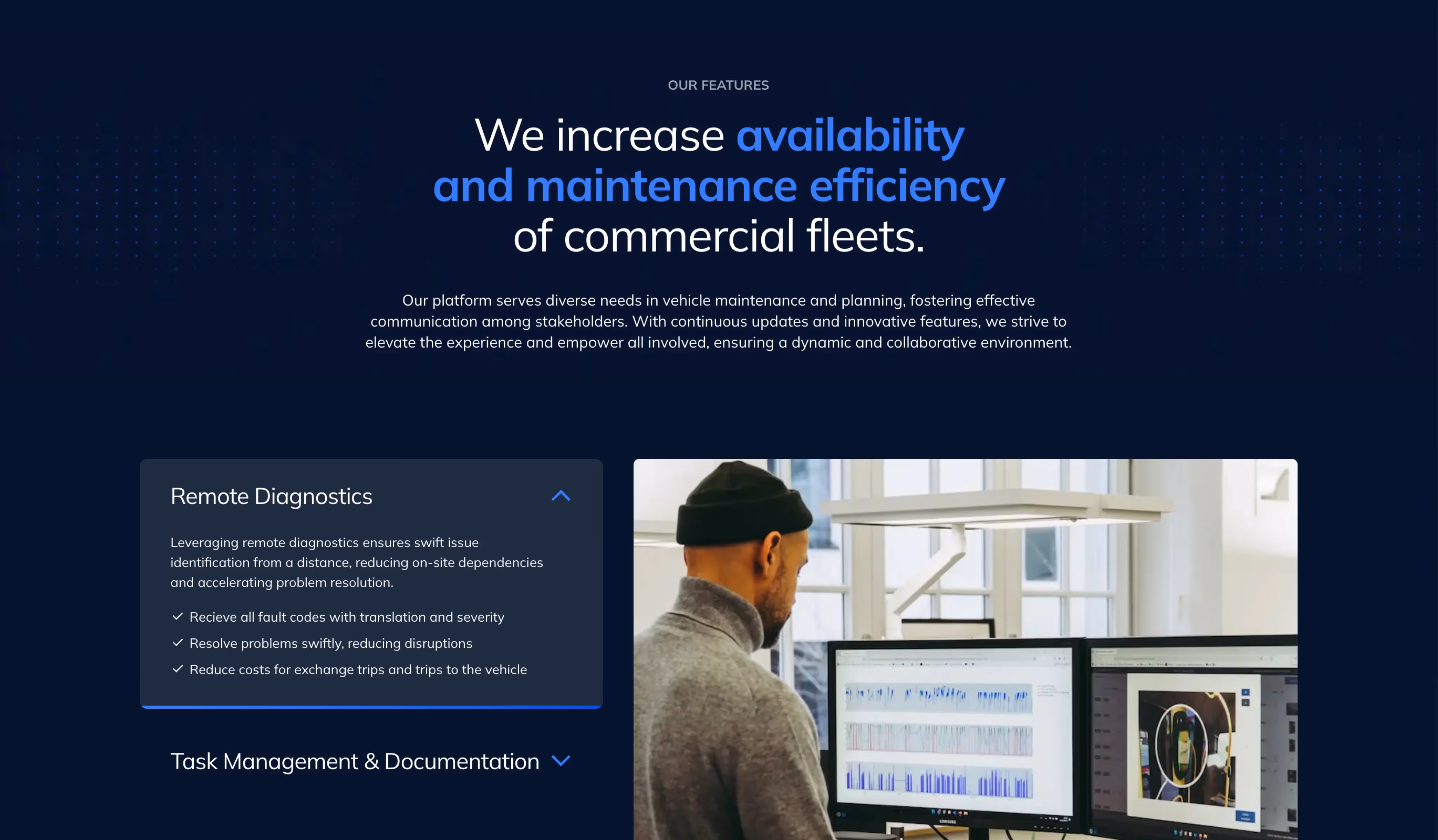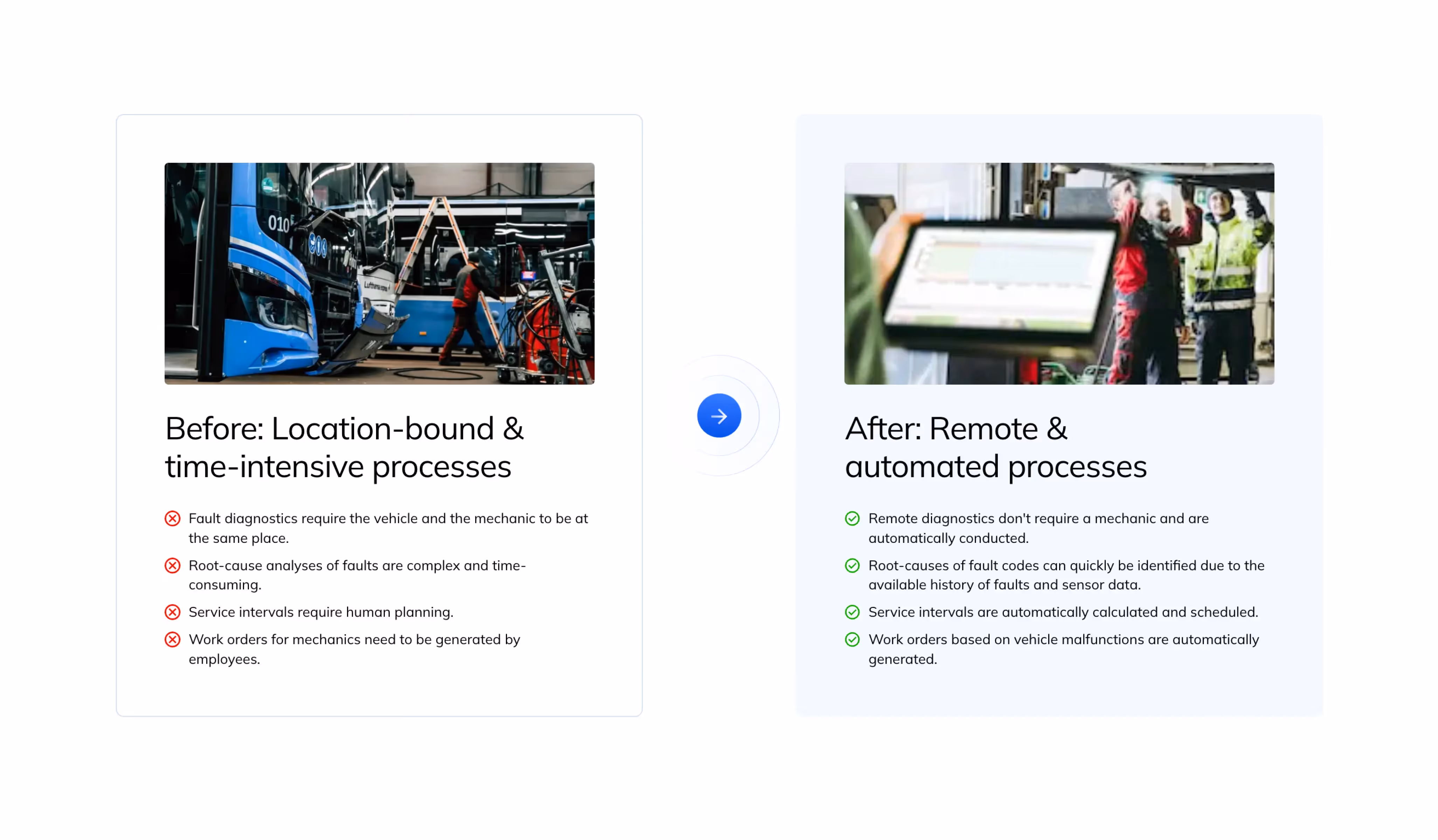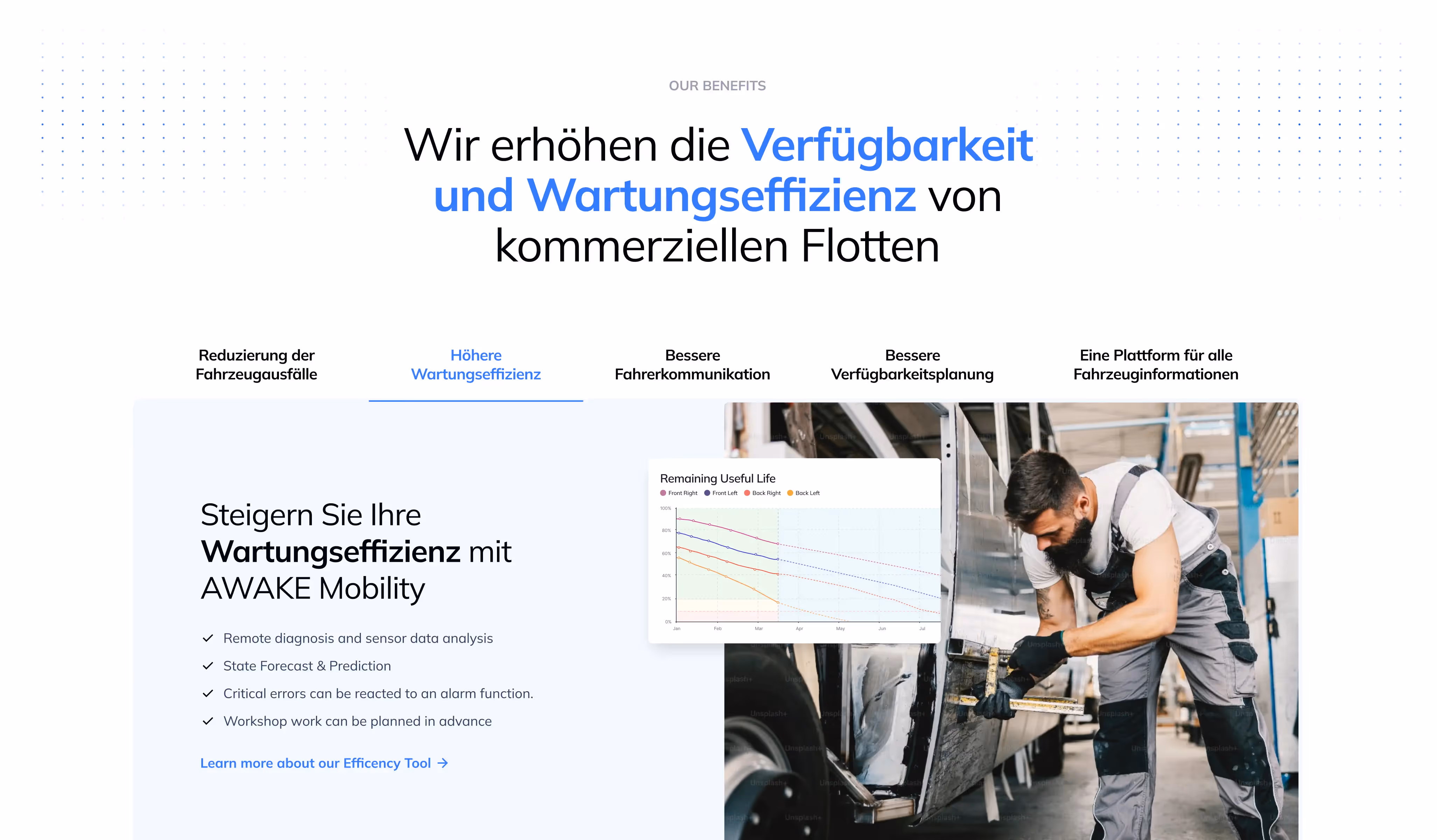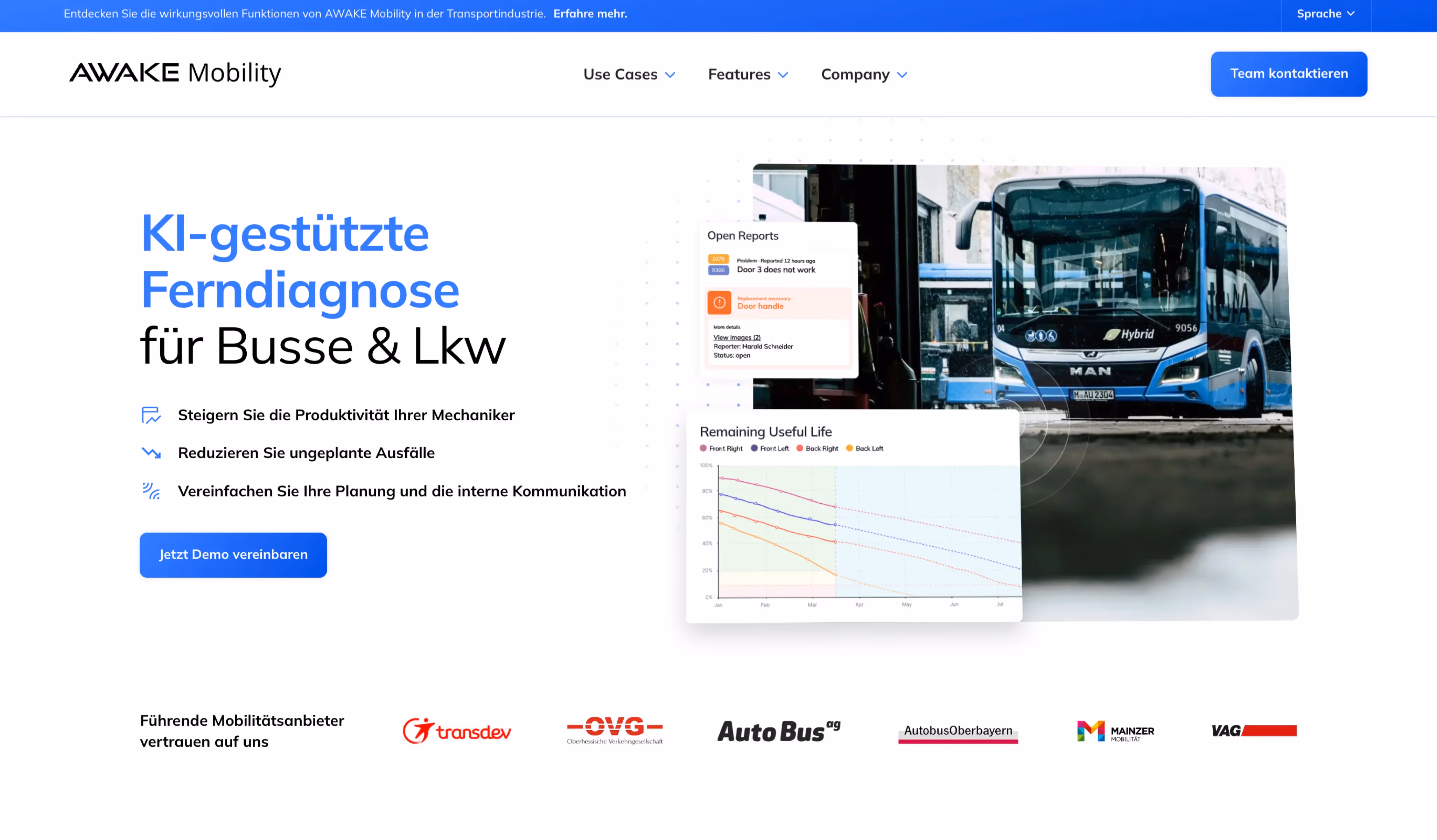 Webseite ansehenDie All-in-One-Plattform von AWAKE Mobility lässt sich nahtlos mit verschiedenen Fahrzeugmarken integrieren. Sie liefert detaillierte Fahrzeuginformationen in Echtzeit und interpretiert Fehlercodes aus der Ferne für verschiedene Fahrzeugmarken. Dies ermöglicht eine proaktive Problemlösung, die kostspielige Unterbrechungen verhindert und die organisatorische Effizienz durch optimierte Prozesse verbessert.