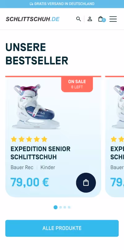 Durch ein modernes Design, das sich von der Ästhetik der Schlittschuhkufen inspirieren lässt, gelang es uns, gezielt junge Menschen und Familien anzusprechen. Die Website wird nicht nur zu einem Schauplatz für hochwertige Schlittschuhe, sondern auch zu einem Ort, der die Leidenschaft und Freude am Schlittschuhlaufen in jeder Facette einfängt. Unsere sorgfältige Gestaltung strebt danach, nicht nur funktional zu sein, sondern auch ästhetisch ansprechend, um so eine inspirierende Plattform für alle Schlittschuh-Enthusiasten zu schaffen.