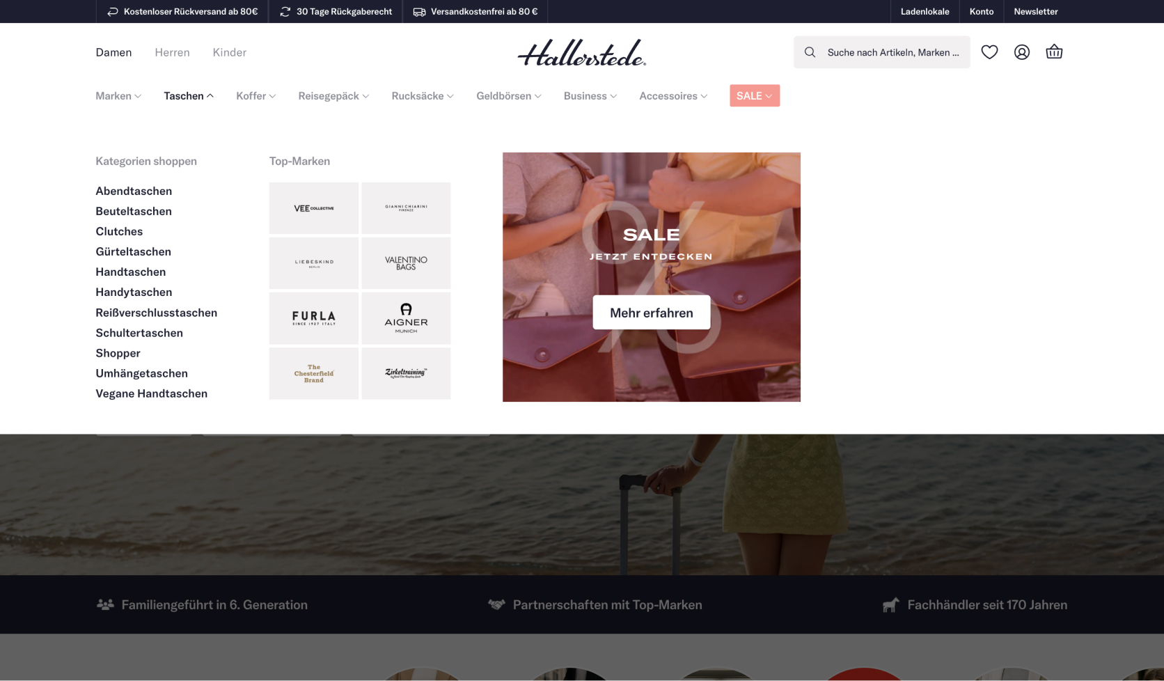 Das Oldenburger Traditionsunternehmen Hallerstede betrieb Ihren Online-Handel lange Zeit unter der Subbrand Kofferworld. Da der Name Kofferworld das Sortiment zu stark einschränkte und die Abgrenzung zum Wettbewerb erschwerte, sollte der gesamte Auftritt unter der Hauptmarke Hallerstede vereint werden. Ziel war ein Markenimage, das der 175-jährigen Expertise im Fachhandel für Lederwaren, Schulranzen und Reisegepäck entspricht – konsistent über den stationären Laden und den Onlineshop hinweg.