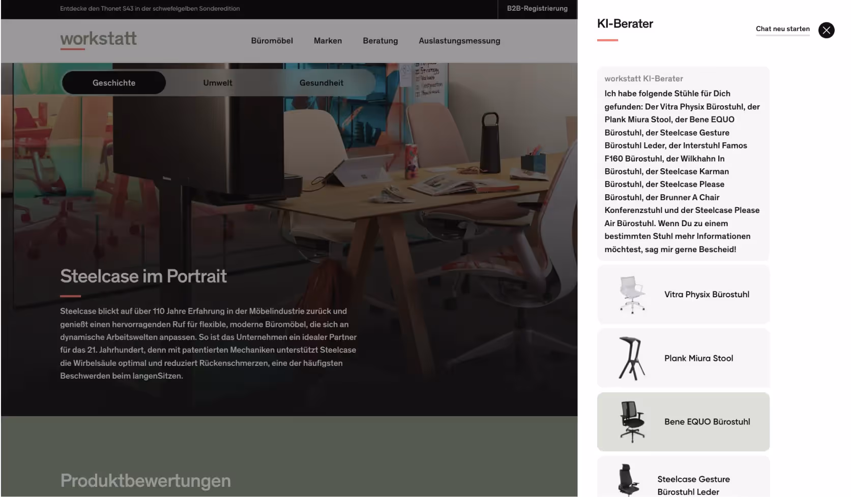 Das Theme wurde um einen KI-Berater erweitert, der Kunden bei der Produktauswahl unterstützt, sowie um Bundle-Upsells für sinnvolle Möbelkombinationen. Diese Features helfen dabei, den Beratungsprozess zu digitalisieren und den durchschnittlichen Bestellwert zu steigern.