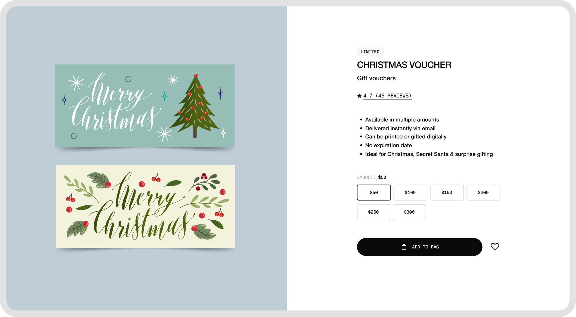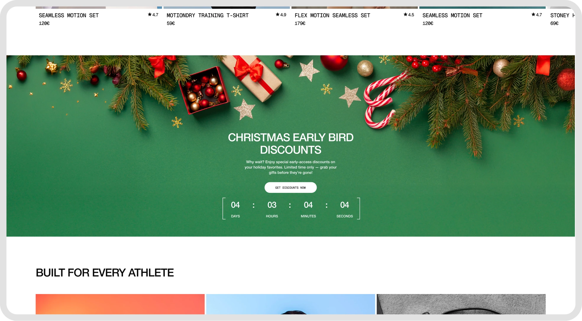 Aktualisiere deine Startseite mit einem warmen Weihnachtsbanner, streue saisonale Elemente wie Schneeflocken oder Geschenk-Icons über deine Website und passe deine Farbpalette an wärmere Töne wie Dunkelrot, Tannengrün oder Gold an. Vergiss nicht, auch Produktseiten und den Checkout-Prozess im festlichen Stil zu gestalten: Das schafft ein durchgängiges, begeisterndes Erlebnis, das Weihnachtseinkäufe aufregend und unvergesslich macht.